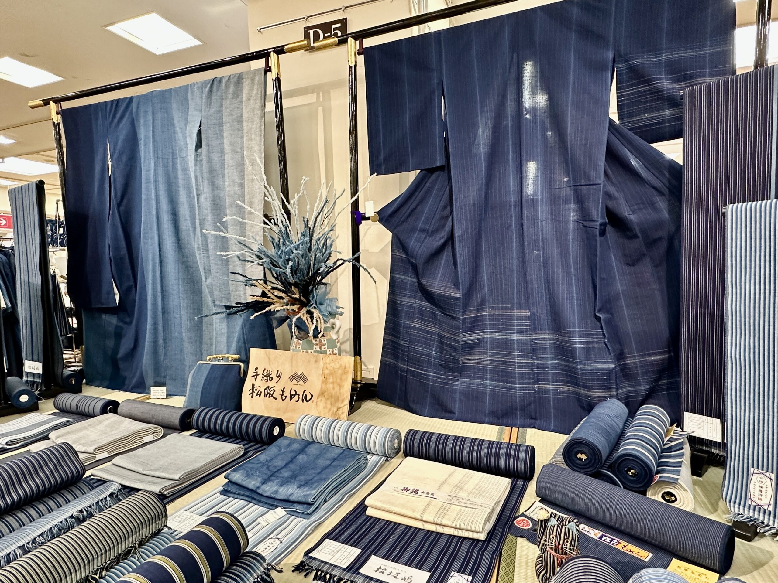 松阪木綿は、天然藍の先染め糸を使って織り成す縞柄が特徴な綿織物です。江戸初期頃から生産されるようになり、江戸に進出した松阪商人によって松阪もめん(当時は伊勢木綿、もしくは勢州木綿と呼ばれた)が大流行しました。特に、日本橋大伝馬町一丁目には、伊勢国出身の木綿問屋が集まり、歌川広重の錦絵にもその様子が描かれています。当時、江戸では、倹約令によって華美な着物を堂々と着られなくなっていたところでしたので、遠目から見ると無地のように見えて近づいてみると、様々な縞柄模様が粋でおしゃれだとして、江戸っ子を魅了しました。なお、松坂木綿の特徴的な縦縞の柄は、現在のベトナムにあたる安南から渡ってきた「柳条布(りゅうじょうふ)」という、文字通り柳の葉の葉脈のように細い縞柄の綿布が起源だといわれています。明治時代になると、海外から安価な布が輸入されるようになった影響を受け、また、その後の生活様式の洋装化などで衰退していきました。